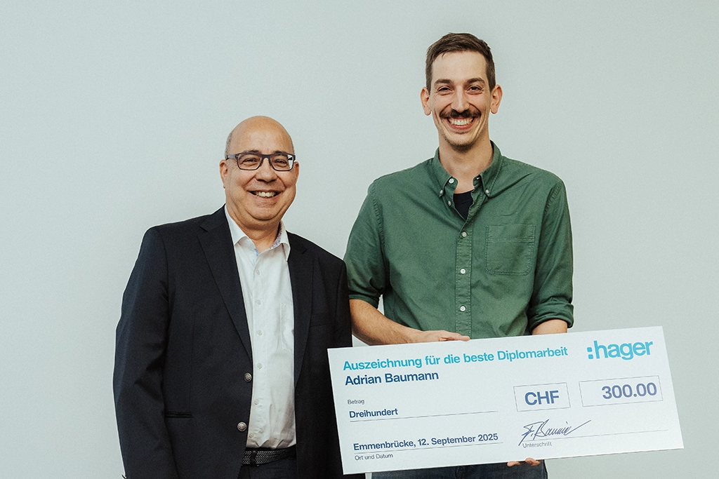Im Rahmen der Diplomfeier an der ABB Technikerschule in Baden wurde Adrian Baumann für seine ausserordentliche Leistung ausgezeichnet. Seine Diplomarbeit erhielt die Bestnote 5,6 und wurde als beste Arbeit der Abschlussklasse 2025 prämiert. Der Diplompreis wurde von der Hager AG gesponsert und offiziell überreicht.